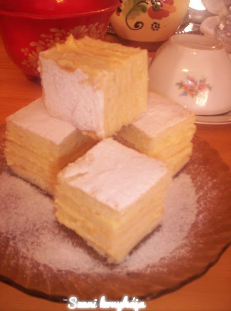 Kockákra szelve, porcukorral megszórva tálaljuk.