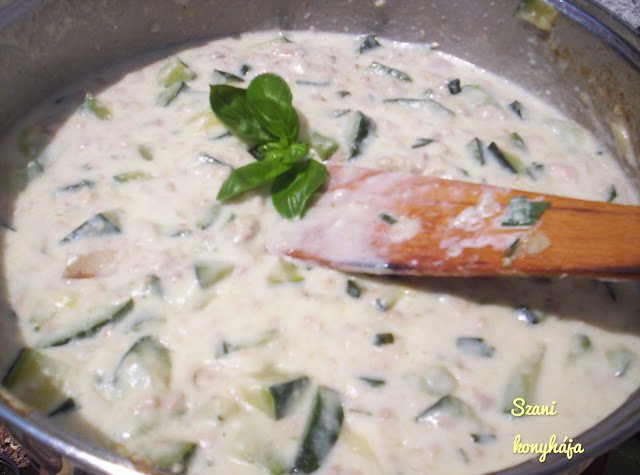 Mikor a cukkini már érezhetően puha, egy kis vizet tehetünk alá, majd nemsokkal utána következhet a tejszín, melybe belekevertük a csapott evőkanál lisztet.