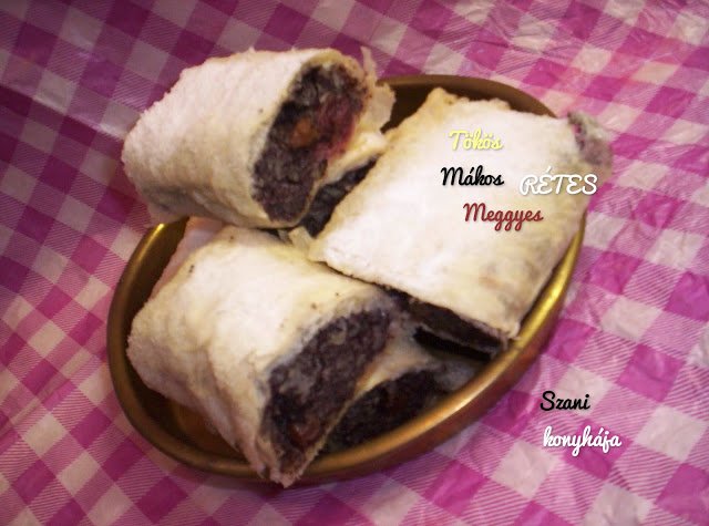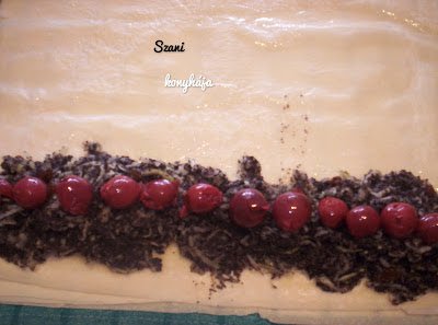 Arra terítjük a mákos tököt és végig sorakoztatjuk meggyel.