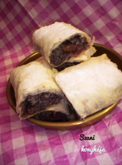 A darált mákot kikeverjük a porcukorral, a citrom héjjal és levével ill. ha van a befőttlével.