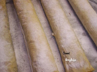 A konyha ruhával megemeljük a réteslapokat és a segítségével feltekerjük, majd sütőpapírral bélelt tepsibe helyezzük.