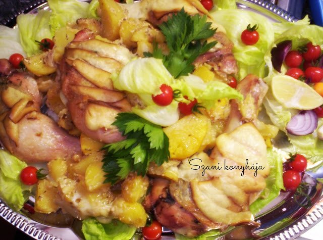 Mikor félig már kész, a burgonyákat kissé átkeverjük, a combokat átfordítjuk, hogy a bőre megpiruljon és tovább sütjük.