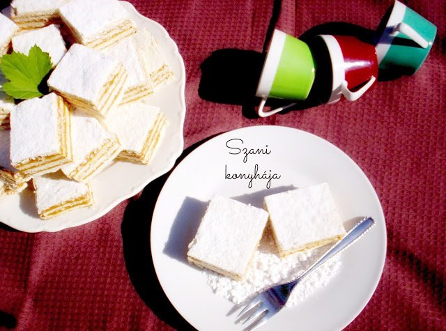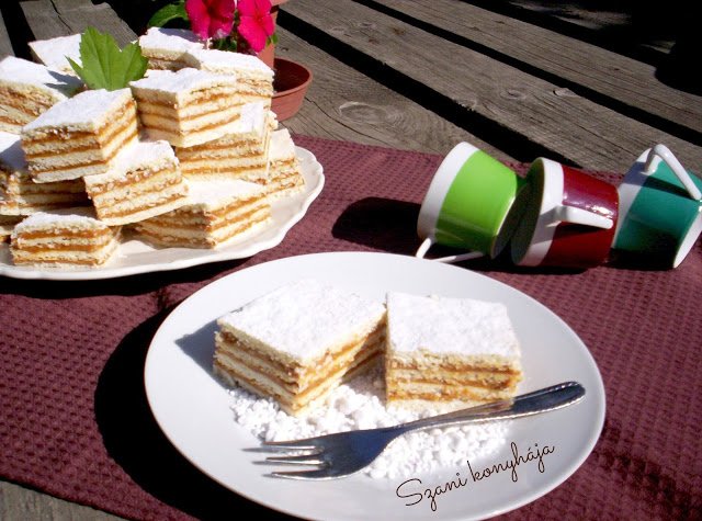 Megsütöttem, de nagyon nem sikerült! :(Sajnos nagyobb tepsim van, így nagyon vékonyak lettek a lapok. Ez még nem is lett volna nagy baj, de a krém…kihűlt a karamellás alap, hozzákevertem a margarint…pfff darabos lett, foltos. Hogy is mondjam. Olyan lett mintha ütötték volna egymást, nem értettem! 🙁 De azért összeraktam, meglátom mi lesz! 🙂