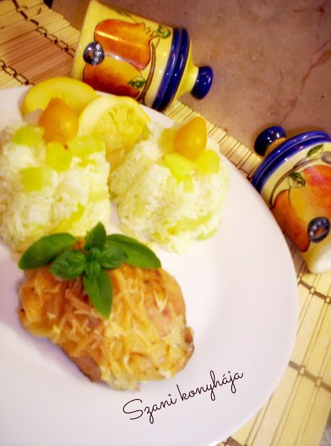 Ha a cukkini elkészült a rizshez keverjük és a közben elkészült csirkecombokkal, frissen tálaljuk, hozzá salátát kínálunk.