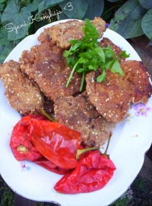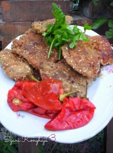 3 tojás, liszt, prézli, 1-2 ek. szezám mag, 2-3 ek. olaj-a panírozáshoz