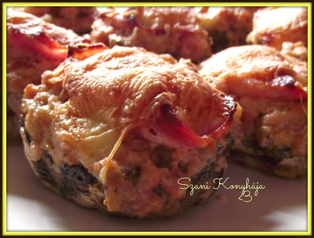 A szalonna csíkokat megfelezzük és V formát hajtva belőlük a gombára tesszük.
