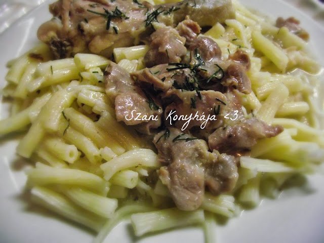 Forrón, tésztával vagy nokedlivel tálaljuk, további kaporral díszítve. 🙂