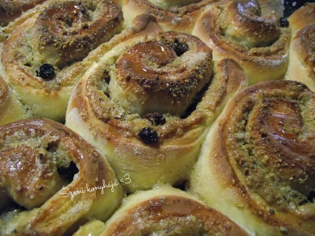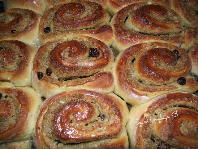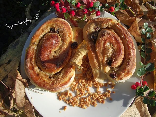 Téglalap alakúra, fél cm vastagságúra kinyújtjuk. Megkenjük a kikevert krémmel. (A krémhez a Rama margarint a cukrokkal, a citromhéjreszelékkel habosra keverjük, és hozzáadjuk a mazsolát.)