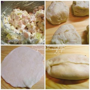 A közepére halmozunk a töltelékből, majd a két széleit egymásra hajtjuk, az illesztésnél összecsipkedjük, ahogyan a két végét is, miután azt is behajtottuk. Mikor ez megvolt, kissé megnyomkodjuk ill. eligazítjuk , így a töltelék is eloszlik benne.