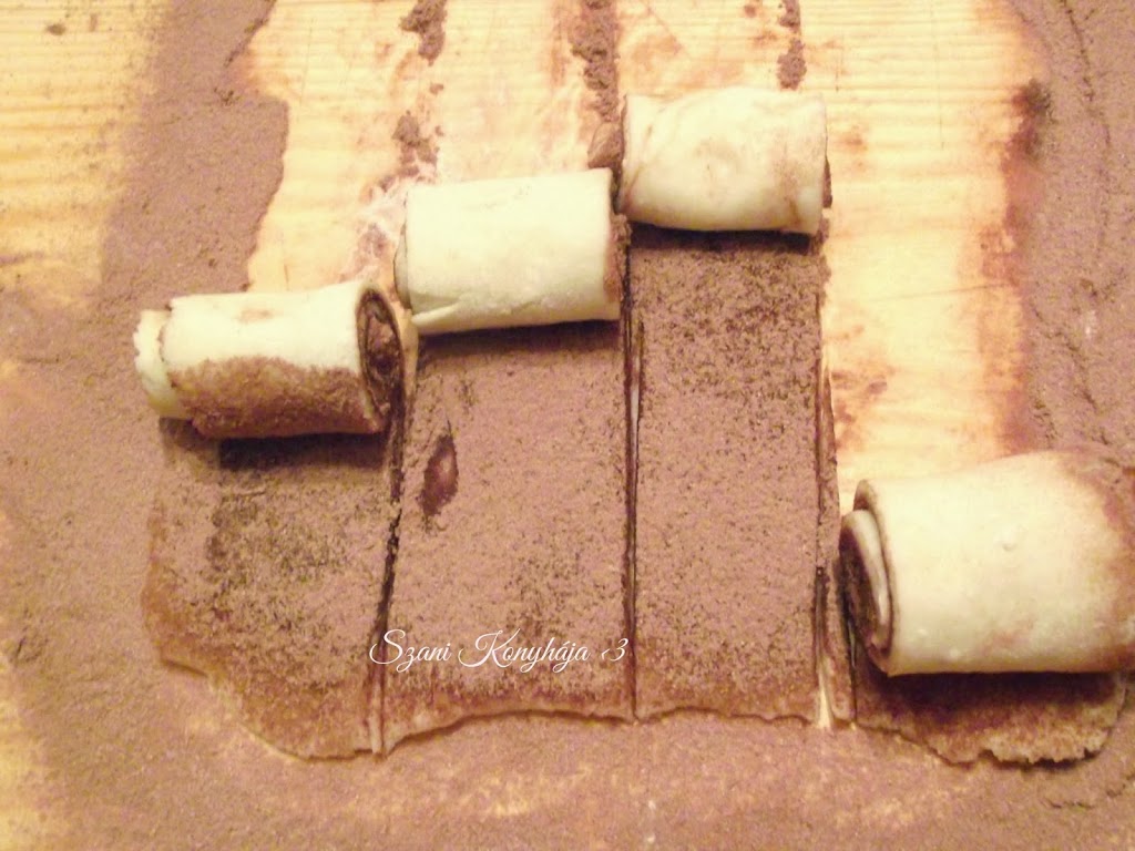 Szépen átgyúrjuk, majd 8 kis gombócra osztjuk, melyeket egyenként lisztezett deszkán kinyújtjuk.A kinyújtott tésztát (ecset segítségével) lekenjük az olajjal, majd rászitáljuk a porcukros kakaót, négy egyforma csíkra vágjuk.