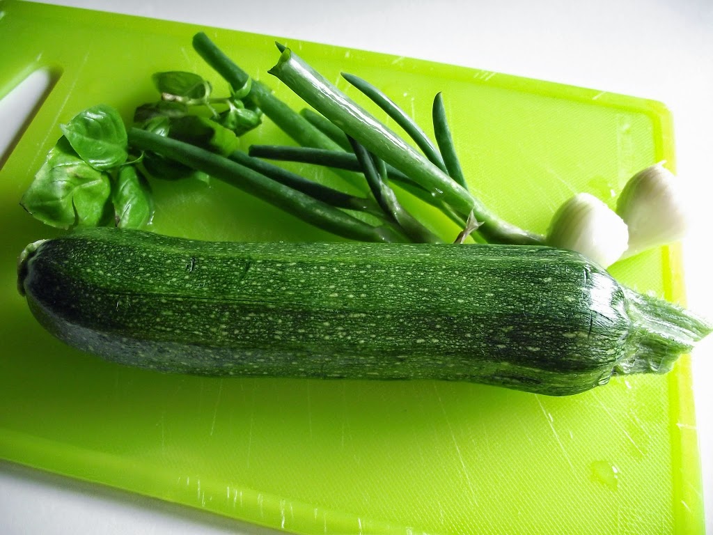 A túrót villával áttörjük, hozzáadjuk a sajtot, az apróra vágott cukkinit, hagymát, bazsalikomot.