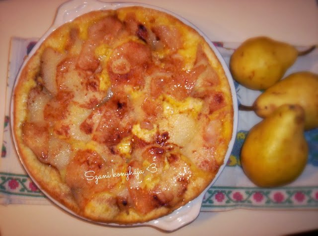 Tegyük a tésztát a tortaformába, rendezzük el rajta a körte szeleteket és szórjuk meg a fahájjal ill. a kristálycukorral.
