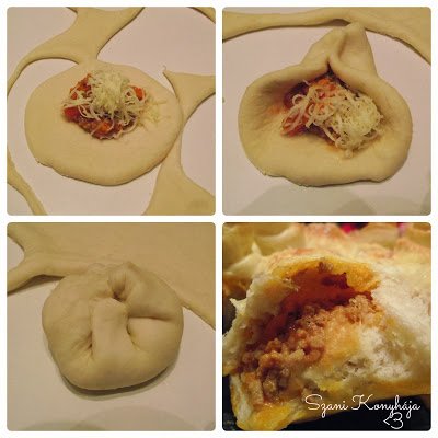 A tésztát egy nagyobb méretű lisztbe mártott bögrével kiszaggatjuk, és egy kanállal a közepébe adagoljuk a bolognait, melyre aztán a sajtot tesszük (Rácz Noéminek üzenem, hagyja ki bátran!! 😉 )