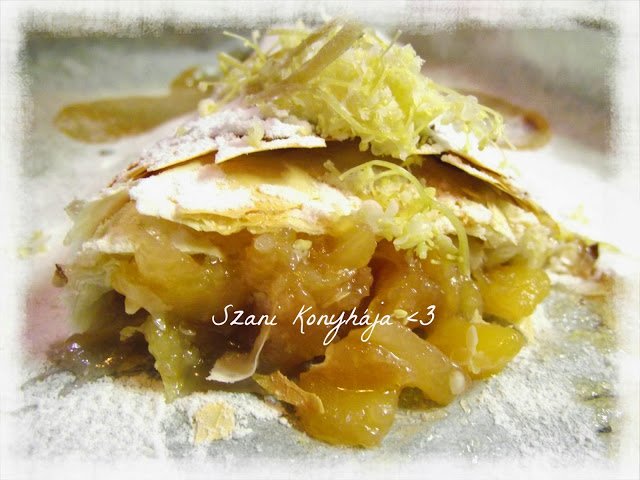 A leveles tésztából, a körték méreteihez képest, némileg nagyobb kockákat vágunk, mellyel beburkoljuk a gyümölcsöt.